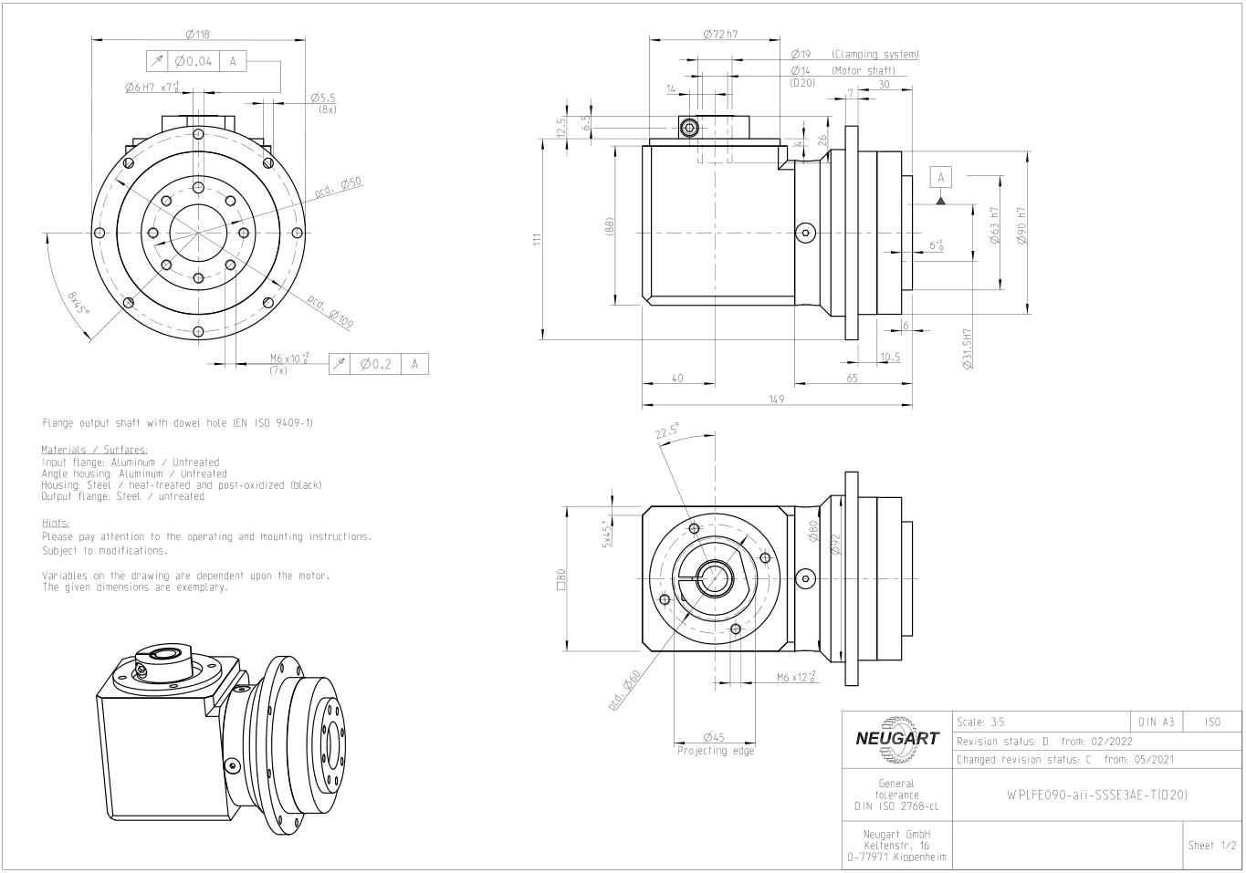 WPLFE right-angle planetary gearbox adopts flange output mode, the overall structure is compact, saves one third of the installation space, and can be installed normally in some relatively narrow installation environments. This WPLFE gearbox has high torsional rigidity, and the built-in positioning pin holes also provide a certain safety guarantee for installation. The WPLFE gearbox has three structural sizes of 64, 90, and 110 to choose from. The overall structural size can be understood in the drawings below. If you need to customize it, you can contact the technology online. Planetary gearbox CAD drawing download, 3D model download, etc. are available.